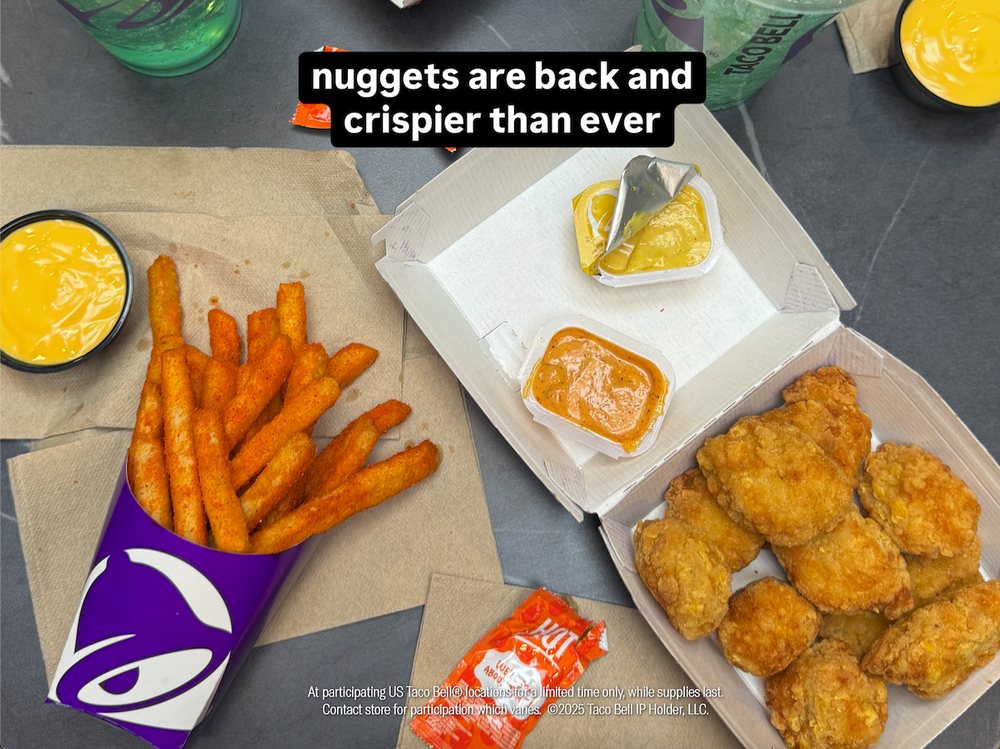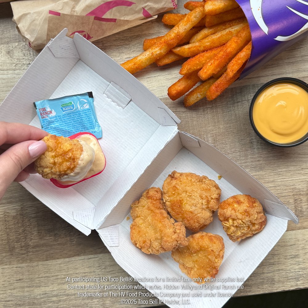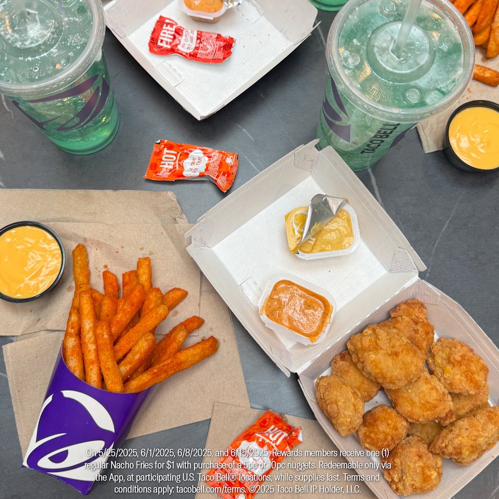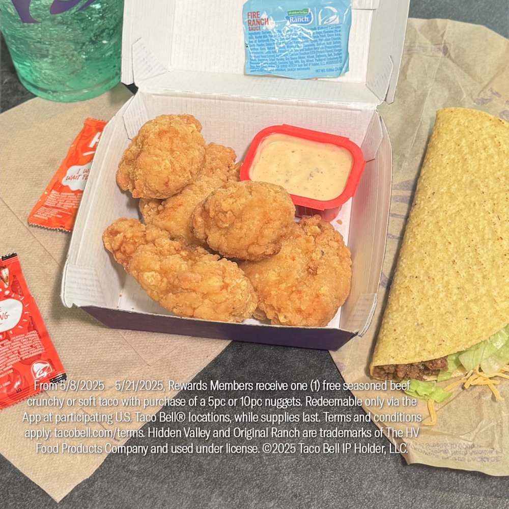 Includes two Caliente Cantina Chicken Crispy Tacos, a Crunchy Taco, Chips and Nacho Cheese sauce, an Avocado Verde Salsa sauce packet, and a medium fountain drink. One Avocado Verde Salsa Packet while supplies last.